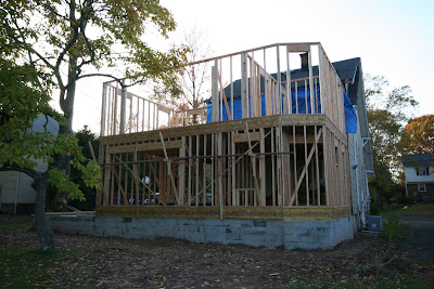 The last post I made here on the construction was Sunday, October 26 and the framing of the first floor addition had just been completed. Despite a few delays here and there due to rain, the construction has been progressing really well. It looks as though we are ahead of schedule, which has put a bit of pressure on me to make some quick decisions on things, but I can't complain. I certainly don't want to be the cause of any loss of momentum on this project. Besides, it's good for me to have strict decision deadlines, because I tend to be indecisive and change my mind a lot when I have too much time to think about it.