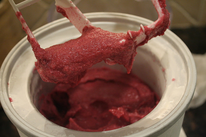 Pour the grape mixture into the freezer container of your ice cream maker and process for 15-20 minutes, or until the sorbet is the consistency of soft serve ice cream or a thick, smooth apple sauce.